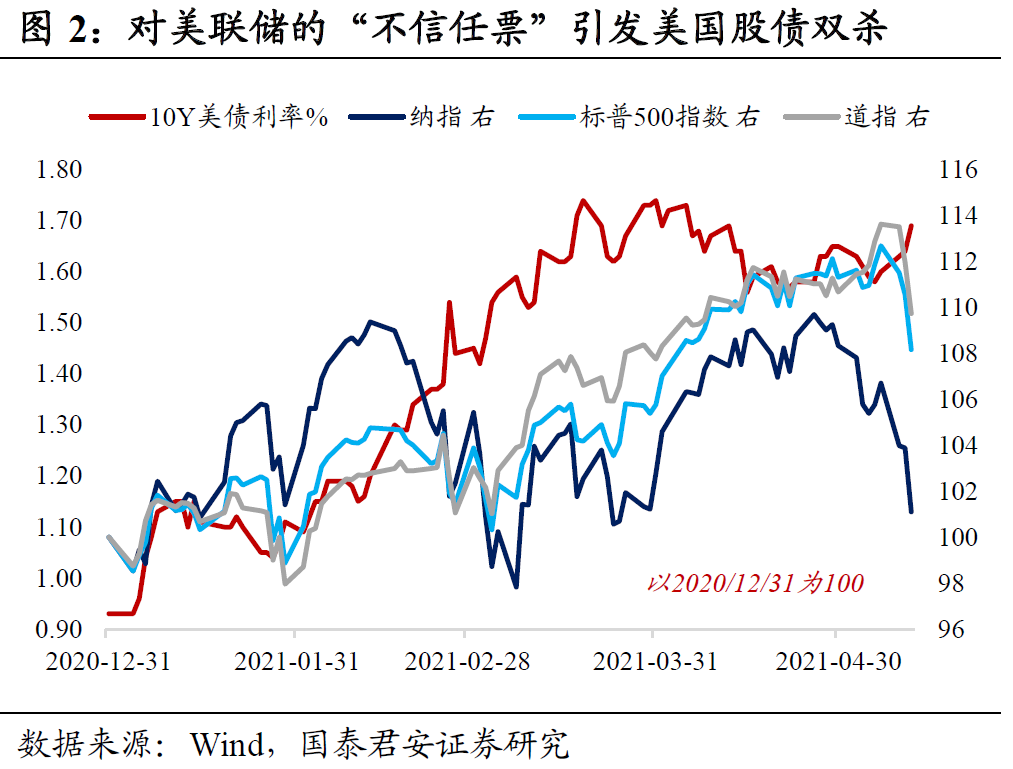 海外再度動盪,核心不在於美國通脹數據本身,而在於市場對美聯儲可能誤判通脹的擔憂正在加劇。一旦“通脹風險是暫時性”的判斷被打臉,美聯儲將不得不“急轉彎”而加快緊縮步伐,而且當前這種擔憂無法被證偽,即便美聯儲副主席克拉里達馬上發聲安撫也是杯水車薪。因此,市場重演2-3月份的劇本,對美聯儲的“不信任票”引髮美國股債雙殺。