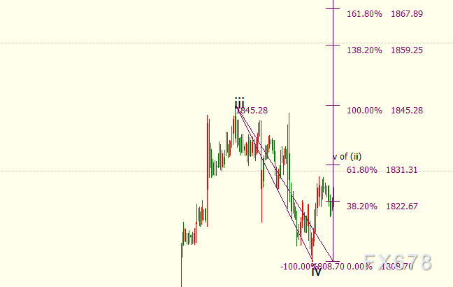 自1678美元開啟上行5浪走勢。小時圖上看,金價自1808美元開啟上行v浪走勢,升破38.2%目標位1823美元,上方阻力看向138.2%目標位1859美元和161.8%目標位1868美元。v是自1756美元開啟的上行(iii)浪的子浪,(iii)浪是5浪的子浪。