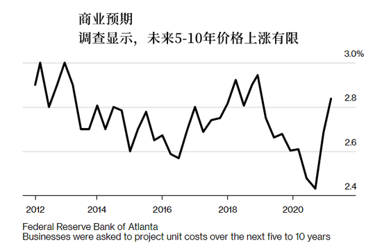 企業對商品的定價權也是影響物價的一個方面。除了轉嫁大宗商品價格外,大多數美國公司仍不願提高其他商品的價格。亞特蘭大聯儲對企業的調查顯示,大多數企業預計明年通脹會回升,但對未來5至10年的預期沒有太大變化。