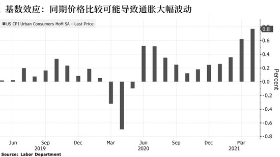 當上年同期的通脹數據出現較大波動時,本年度12個月的通脹數據也會因為“基數效應”而大幅波動。去年疫情造成經濟停滯及物價大幅下跌,今年的基數效應將特別明顯。鮑威爾在4月的新聞發布會上說: