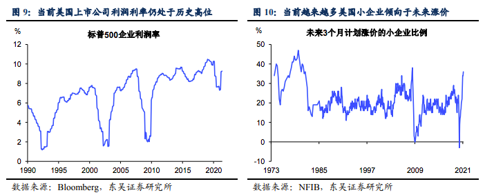還有一點值得關注的是企業的漲價意願。一般認為這會使得其在面臨投入成本上升時,更傾向於通過攤薄利潤而非漲價來消化(圖9)。但從最新的調查來看,美國小企業中傾向於在未來3個月漲價的比例已接近歷史高位(圖10)。