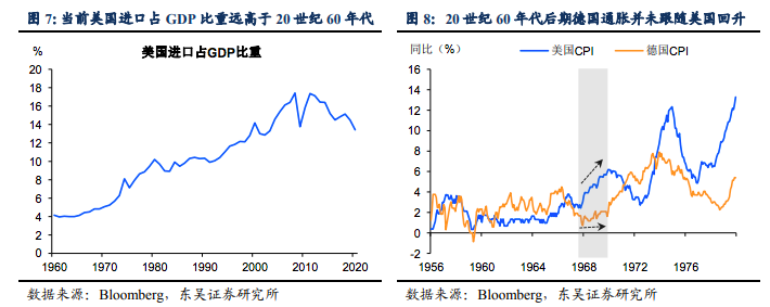 20世紀60年代的美國經濟更具有自給自足的特徵。當時美國的進口占GDP的比重僅為4%,遠低於當前的13%(圖7)。一旦國內的需求超過供給,很難通過其他國家的生產來滿足,而只能以物價上漲的方式來消化。正因如此,我們發現美國在20世紀60年代後期的通脹回升只是國內現象,同期歐洲國家(如德國)的通脹一直保持穩定(圖8)。