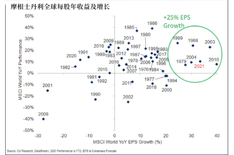 全球企業收益在去年11月疫情封鎖期間見底,這就意味著在那時,市場仍處於復蘇週期的第一年。花旗預測,隨著全球經濟重新開放,2021年企業收益將飆升36%。