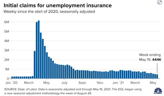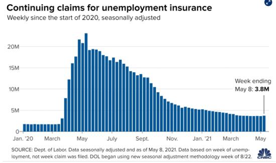 Covid-19疫苗的持續強勁增長刺激了經濟反彈,美國每天仍接種180萬支疫苗。據截至5月1日的數據顯示,隨著領取福利金的人數持續下滑,領取福利金的總人數減少了近90萬人,接近1600萬人。