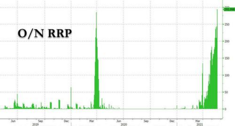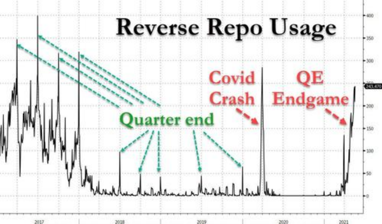 最近幾週,ON RRP使用情況可能更加值得關注,因為有數據顯示,ON RRP的用量剛剛創了近幾年新高,以當前的這種增長形勢,美聯儲的QE可能就要走到尾聲了。