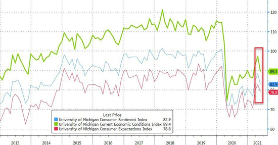 金融博客ZeroHedge在數據出爐之後的分析中指出,本月82.9的消費者信心指數終值,呼應了此前美國經濟諮商局(The Conference Board)調查的結果。此外,本次調查當中的經濟現況指數和消費者預期指數均出現下跌,距離疫情前水平仍有顯著差距。
