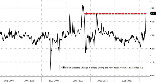 此外本次調查當中,有創紀錄數量的受訪消費者表示住房、汽車、家庭耐用品的價格出現上漲,而ZeroHedge在分析數據時則使用了“擔心物價飛漲的美國人數量創歷史新高”作為標題。不過密歇根大學消費者信心調查的負責人Richard Curtin在報告當中對通脹似乎並不擔心: