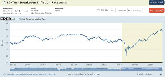 作為參照,衡量美債市場對通脹預期的盈虧平衡通脹率年初以來大體呈上升態勢,目前5年期大體位於2.6%一線,而10年期則位於2.4%~2.5%區間。