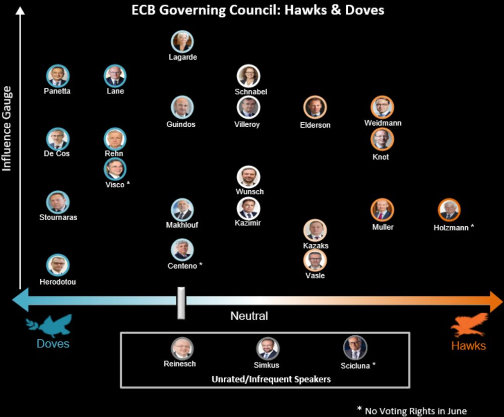 彭博經濟的圖表顯示,在歐洲央行管理委員會內部,包括歐洲央行首席經濟學家Philip Lane、芬蘭央行行長Olli Rehn在內的7位高官均為鴿派,而歐央行行長拉加德、副行長Luis de Guindos也存在鴿派傾向。