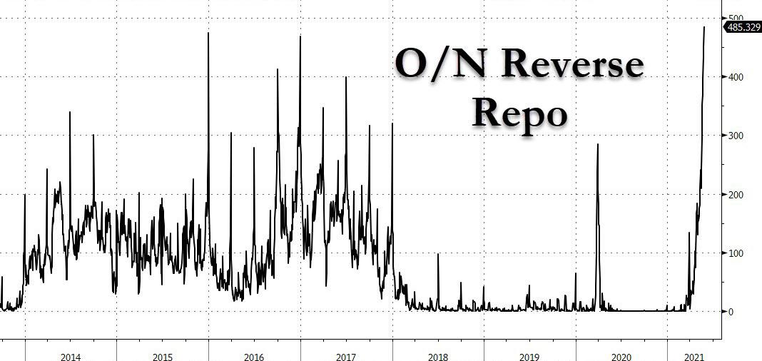 與中國央行的公開市場操作相反,美聯儲通過正回購釋放流動性、逆回購回收流動性。上周華爾街見聞文章在提到RRP用量創史上第三高時就曾指出,RRP的需求和接收量激增正是疫情后無限量QE購債和財政刺激導致的市場流動性過剩體現。RRP用量飆昇說明金融機構都在拆出錢,它們的流動性、主要是短期流動性已經滿溢,並且正在將短期利率壓向負值。