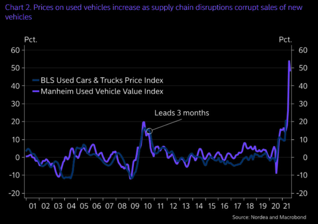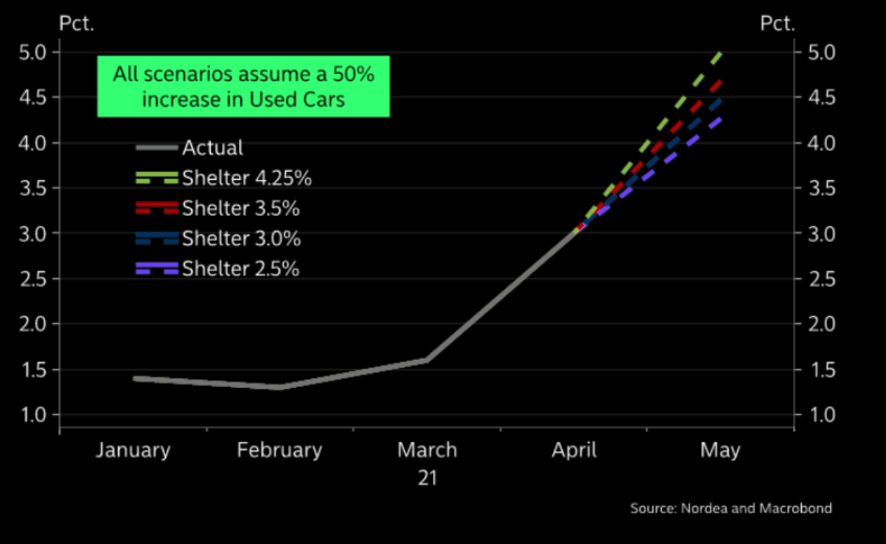 根據Nordea做出的預測,5月美國核心CPI可能達到4%,遠超預期的3.4%;5月或6月總體通脹率可能超過6%。不過Nordea稱,市場仍普遍認為超高通( 134.34 , 2.56 , 1.94% )脹是暫時的。