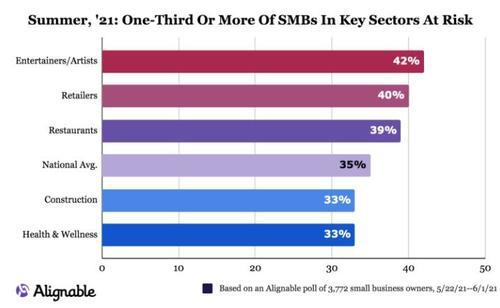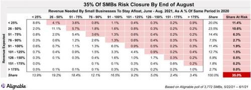 而NFIB的上述報告也得到了小企業聯誼組織Alignable最新一份調查報告的佐證——數據顯示,35%的小企業主仍然面臨著在今夏結束前永久關門歇業的風險!