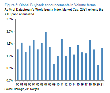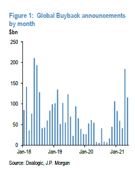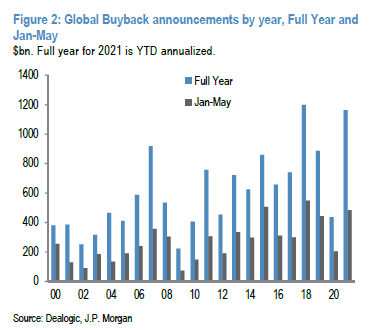 摩根大通(165.66, -0.78, -0.47%)表示,今年全球公司回購大幅回暖,前5個月全球公司回購公告金額為去年同期的2倍多,總金額亦超過2019年同期水平。