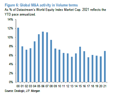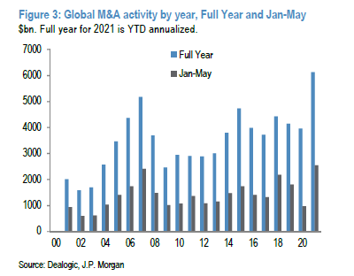流動性充裕亦在其他企業行為有所體現。摩根大通統計顯示,今年以來全球企業並購活動已創下歷史新高,槓桿收購活動則創2007年以來的最高水平。