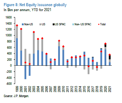 由於SPAC上市活動的火熱,摩根大通估算稱,即便考慮到上述回購/並購/槓桿收購規模金額,全球股市今年依然處於淨發行狀態,若按照年初相關速度繼續發展,2021年全球股票淨發行量預計將達到8600億美元。
