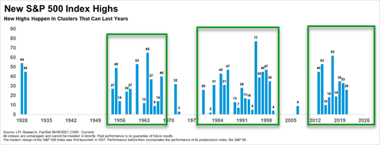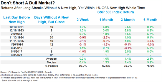研究機構LPL Financial同樣注意到了標普500指數眼下的這一“怪圈”。LPL Financial首席市場策略師Ryan Detrick指出,標普500指數已連續9天(截止6月8日)收盤位在歷史高點的1%以內而沒有突破。而歷史上出現此類現象時,市場接下來的表現並不怎麼出彩。