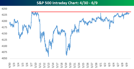 研究機構Bespoke的數據顯示,在過去的12個交易日中,標普500指數盤中高點和低點之間的差距僅為1.65%,比2019年7月以來的任何其他時期都要更窄。而與此同時,上行空間尤為受限。自6月初以來,標普500指數多次嘗試突破5月7日創下的歷史高位4238.04點,但每次都無功而返。