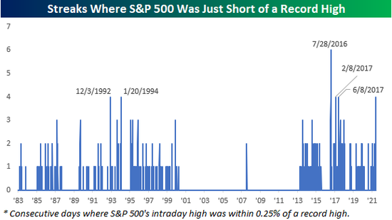 如此頻繁地接近紀錄高位,但每次都難以捅破這最後一層窗戶紙,無疑令不少美股多頭頗為沮喪。Bespoke的統計指出,標普500指數連續多日盤中高點距離歷史高位僅差不到0.25%的情況並不多見。其中,只有2016年曾出現過連續六個交易日的情況,而其餘的連續天數最多也就4天。