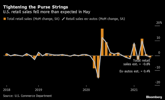 在前兩個月呈現刺激紓困帶來的揮霍之後,美國5月份零售銷售下降,表明隨著經濟重新開放,消費者開始將更多支出轉向服務業。