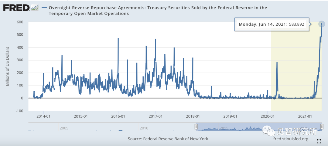 同時,市場的流動性繼續氾濫——週一美聯儲的隔夜逆回購(RRP:Reverse RePurchase)高達5839億美元,再創歷史新高。