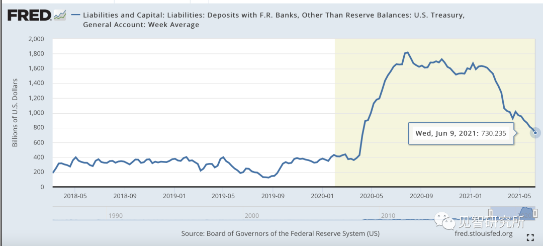 圖:美國財政部在美聯儲的賬戶餘額快速下降:從最高1.8萬億美元快速下降了1萬多億