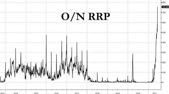 此前有文章曾介紹,與中國央行的公開市場操作相反,美聯儲通過正回購釋放流動性、逆回購回收流動性。隔夜逆回購具有回籠流動性的功能,貨幣市場基金和銀行等合格交易對手方將現金存入美聯儲,進而換取美國國債等高質量抵押品。此前,動用隔夜逆回購工具的利率ON RRP儘管只有零,仍然吸引了大批資金。這代表追逐短期收益率的資金根本無處可去,只能無息放入美聯儲。