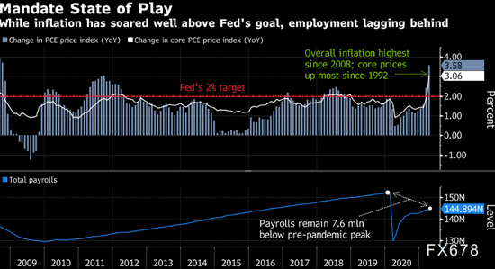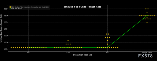 美聯儲上調了截至2023年末的通脹預測。2021年個人消費支出(PCE)價格指數漲幅的預測中值由2.4%提高至3.4%,2022年預測從2%上調至2.1%,2023年預測從2.1%上調至2.2%。