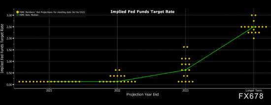 季度預測顯示,18位美聯儲官員中的13位預計2023年末前將至少加息一次,3月抱有同樣預測的官員有7位。11位官員預計2023年末前將至少加息兩次。此外,7位官員預測最早加息的時間可能在2022年,多於3月時的4位。