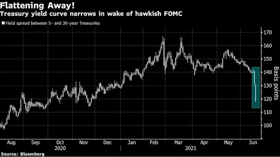 不少業內分析師表示,美聯儲提前加息的預期可能削弱了通脹前景。美聯儲最新利率點陣圖預期2023年底之前將加息兩次,這一轉變推高了較短期限的市場利率,並製約了長期通脹預期,這是導緻美債收益率曲線趨平的最主要原因。貨幣市場交易員們甚至已經把對美聯儲加息25個基點的定價預期提前到了明年第四季度。