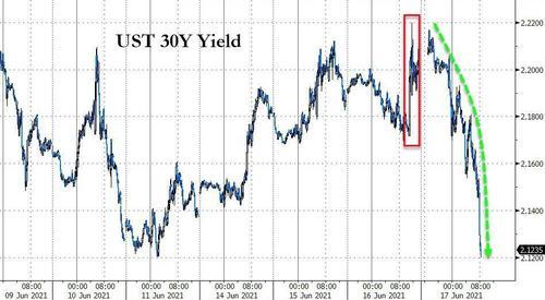行情數據顯示,指標10年期美債收益率隔夜尾盤下跌7.3個基點報1.51%,盤中一度跌破1.50%關口,重返美聯儲利率決議前的低位;而更為長期的30年期美債收益率跌幅則更為明顯,紐約尾盤下挫11.5個基點,報2.093%。