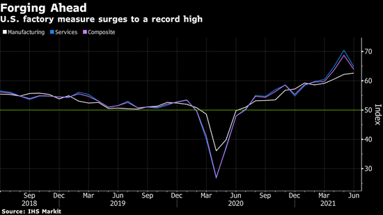 在防疫限制放鬆和國內經濟走強的推動下,一項衡量美國製造業活動的指標在6月份以2007年有數據以來的紀錄最快速度擴張。