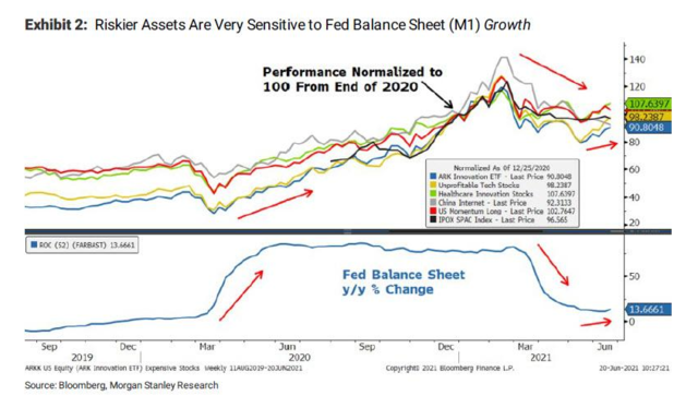 過去幾個月的市場表現印證了Wilson的看法。美聯儲的資產負債表(M1)增長在2月中旬達到頂峰,與此同時,一些高估值或投機性高的股票也在這個時候見頂了。在此前12個月,當美聯儲資產負債表大幅擴張的時候,也正是這些股票漲勢最猛的時候。