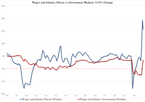 在細分收入方面,政府工資同比增長3.5%,高於4月份的1.3%,而私人工人工資同比增長15.7%,低於4月份創紀錄的19.3%。
