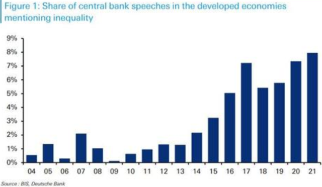 Reid的統計柱狀圖也顯示,隨著時間的推移,發達經濟體央行官員提及“不平等問題”的概率越來越大。