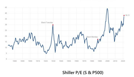後來羅伯特·J·席勒(Robert J. Shiller)以此出版了書,在書中他預言美國的股市正處在“非理性繁榮”的高點,股價很可能會出現拐點。在《非理性繁榮》一書中,他畫出了自1860年以來,美國股市的市盈率曲線圖,發現在140年的歷史上,出現過1901年、1929年和1966年三個峰值點,而歷史的事實是,它們都成為了大股災的前奏時刻。這個是Shiller P/E,或者周期性調整市盈率(Cyclically adjusted price-to-earnings ratio)。