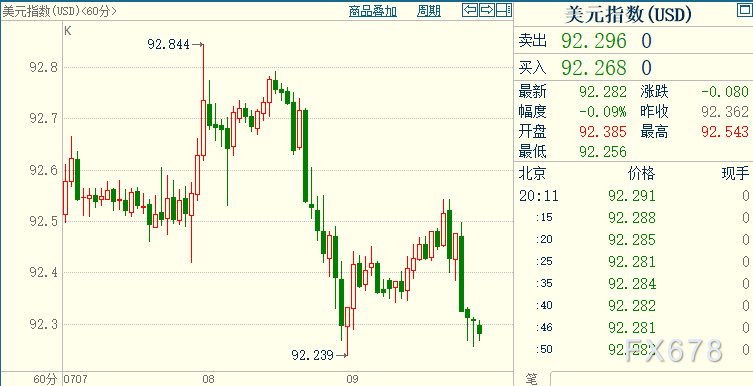 北京時間20:10,現貨黃金下跌0.07%至1801.53美元/盎司;COMEX期金主力合約上浮0.08%至1801.6美元/盎司;美元指數下跌0.08%至92.290。美指早盤一度上漲近0.2%。