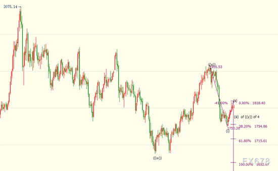 日線上看,金價可能自1818美元開啟下行(iii)浪走勢,下方支撐看向23.6%目標位1779美元和38.2%目標位1755美元。(iii)浪是始於1917美元的((y))浪的子浪,後者則隸屬於自2075美元開啟的調整4浪。