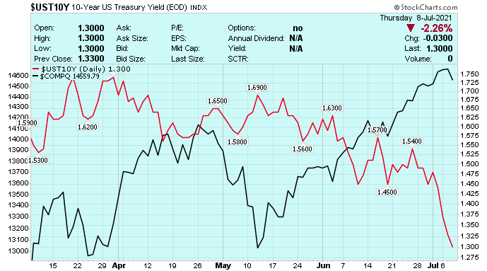 10年期美國國債收益率在第二季度下降了約30個基點,7 月份進一步下滑,週四下午交易價格約為1.3%。相比之下,3 月底時10年期國債收益率超過1.7%。較低的國債收益率是有利於那些回報週期長、對利率敏感的成長型股票。最近幾週,投資者正從價值和周期性轉投成長型股票。