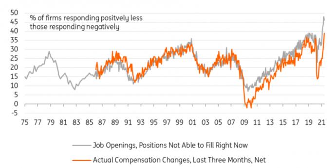 從大多數商業調查中可以清楚地看到,美國企業正面臨供應鏈瓶頸,同時也面臨著合適工人短缺的問題。這些產能限制意味著產出不太可能像我們預期的那樣強勁,第二季度GDP折合成年率接近10%,而2021年全年增長修正為6.7%。