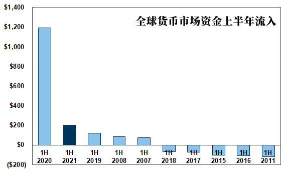 2021年上半年的貨幣市場流入量是有記錄以來第二大的。2020年上半年是最大的。
