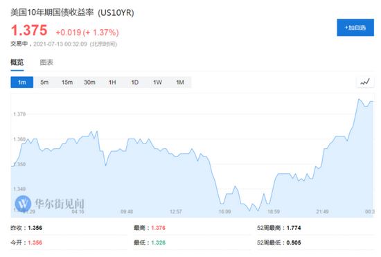 10年期美債收益率日內曾經出現下跌,但在進入美國時段之前觸底並回升,該升勢也延續到了美國時段內。截至發稿,10年期美債收益率報1.375%,日內升1.9個基點。