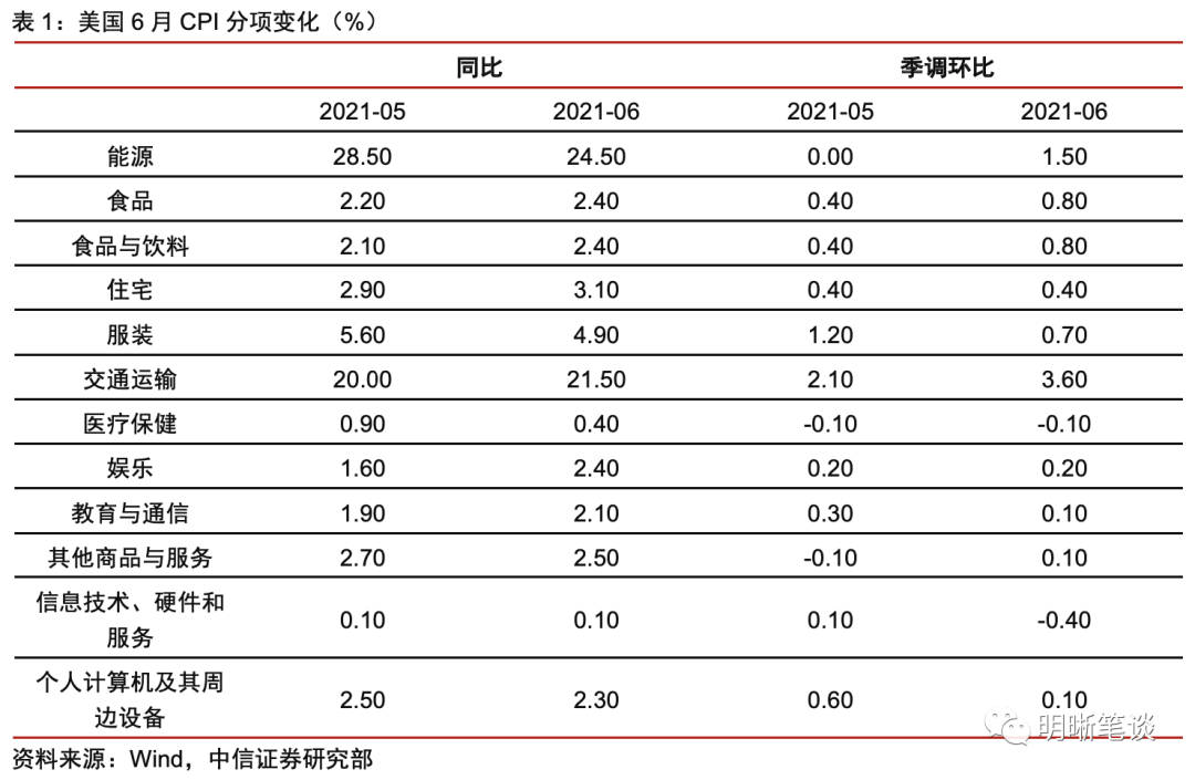 從更加關鍵的CPI分項來看,能源項和交通運輸項依然是CPI分項中保持最高增速的項目,住宅項增速依然維持高位。綜合同比和季調環比數據分析,6月CPI增速最高的仍是能源項和交通運輸項。其中,能源項同比增長24.5%,季調環比增加1.5%;交通運輸項同比增長21.5%,季調環比增加3.6%,繼續維持快速增長勢頭。根據美國勞動部數據,從細項來看,6月二手車和卡車價格上漲10.5%,創有史以來最大月增幅,貢獻了6月美國CPI漲幅的1/3。汽油、燃油、商品和新車的同比增速也均高於2%。此外,住宅項在美國CPI組成中權重佔比約1/3,本月同比增速達3.1%,創2017年5月以來新高。