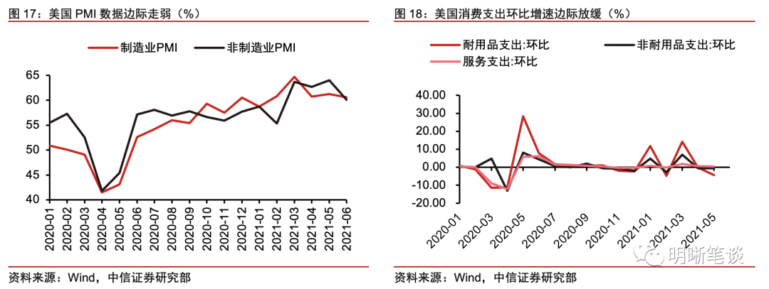 其次,就美聯儲對待通脹的態度而言,昨晚6月PPI數據超市場預期後,美聯儲主席鮑威爾表示:通貨膨脹明顯上升,未來幾個月仍將“居高不下”,如果通脹上升太多,美聯儲準備調整政策。但在隨後的國會證詞中,鮑威爾又表示:美國經濟復甦還沒有達到可以開始收縮資產購買規模的程度,補充稱未來幾個月通脹率可能會保持較高水平,然後趨於平緩。美債收益率也在鮑威爾的表態搖擺中上下震盪。我們認為,國會證詞上的表述很可能在此前就已準備好,而通脹持續超預期後的表述或是美聯儲對於通脹的最新態度。如果美聯儲對通脹做出反應,那麼通脹預期將有下行的可能。7月28日的議息會議以及此後鮑威爾和其他票委對於通脹的表述將是觀察美聯儲態度的重要依據。