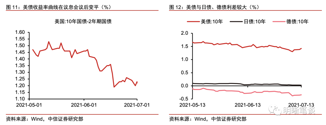 除以上基本面因素外,交易因素也是近期美債利率下行的重要原因。一方面,疫苗大規模接種和美國4、5月份的CPI大幅超預期引發市場大規模的“再通脹交易”,不少債券市場投資者選擇做陡收益率曲線。然而6月美聯儲的議息會議鷹派表態打擊了曲線變陡的預期,在這種情況下,做陡曲線的倉位開始平倉,導致長端債券的買入壓力增加,曲線持續走平:10Y -1Y美債利差由議息會議前的143bps下降到136bps;30Y-10Y美債利差由議息會議前的69bps下降到56bps。另一方面,海外投資者也利用外匯對沖後本國國債與美債的高利差進行套利,尤其是國債收益率接近0的日本和國債收益率為負的德國投資者。此外,6月底,美國養老金在季末和月末進行調倉,增持美國國債,這助推了美債利率下行增。