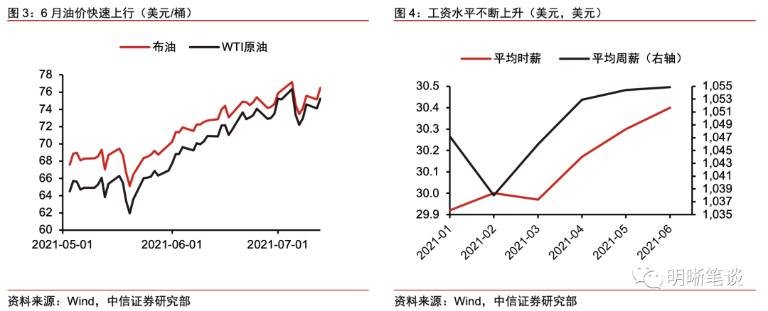 供需缺口和寬鬆政策的持續存在,出行放鬆、油價上漲和工資上升是美國CPI保持高位並屢創新高的主要原因。疫情之後全球復甦不均衡導致周期錯位,供給端受疫情衝擊較為持續,而需求端則率先復甦,供不應求格局形成,同時疊加極度寬鬆的貨幣和財政刺激,價格水平不斷抬升。就6月而言,首先,在出行管制放鬆下,出行需求不斷增加,二手車、新車以及交通運輸服務價格繼續保持高速上漲;其次,在OPEC+談判僵持以及旺盛的預期影響下,油價不斷走高;再次,由於美國勞動力供給不足,企業不斷提升工資吸引勞動力,尤其是低收入工人工資漲幅較快,推動通脹飆升。