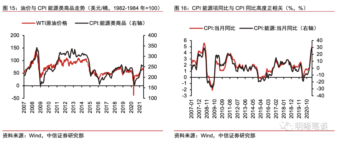 從通脹預期角度來看,美國通脹水平的讀數和美聯儲對待通脹的態度將直接影響通脹預期水平。首先,就通脹水平的讀數而言,6月美國PPI和CPI均大超市場預期,5月PCE和核心PCE數據雖然符合市場預期,但是仍然處於高位。與此同時,與通脹水平密切相關的油價近期也處於高位,OPEC+關於增產的談判陷入僵局,國際能源署警告,如果不增產,石油市場將“顯著收緊”,意味著油價將持續走高。從歷史看,油價上漲是通脹上升的標誌,特別是會帶動通脹預期的上漲。從油價和通脹的關係來看,油價與美國CPI細項中能源類商品的走勢基本正相關;CPI分項中能源項同比與CPI總體同比走勢高度吻合。因此,就通脹水平讀數而言,短期內通脹預期或將持續上漲。