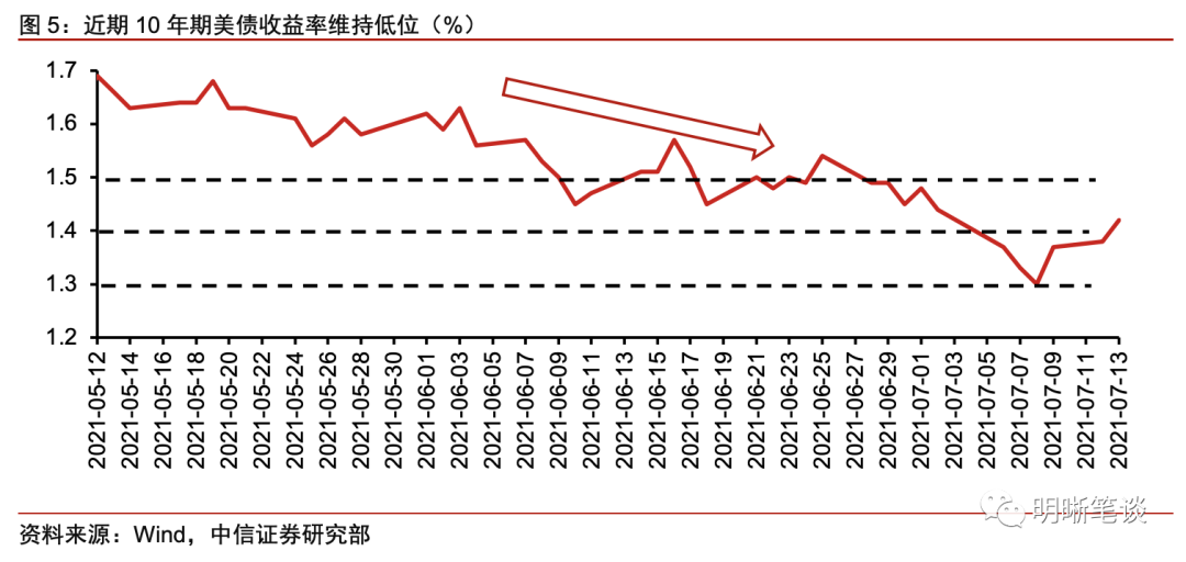 在通脹持續上行的情況下,美債利率持續位於1.4%以下低位的概率不大。根據此前的報告《債市啟明系列20210705—如何看待當前油價與美債利率的分歧?》(2021-07-05),我們認為,當前美債利率在1.4%以下的水平可能存在定價錯誤,其合理中樞或在1.5%附近。因此,短期內在上述影響通脹預期和實際利率因素的博弈下,美債利率或將在1.4%-1.6%之間震盪。