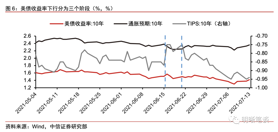 第二階段是美聯儲6月FOMC議息會議到6月21日前後,該階段美債收益率下行主要由於通脹預期快速下行。6月美聯儲議息會議鷹派超出市場預期,在點陣圖、經濟預測以及鮑威爾關於通脹講話的三重作用下,通脹預期快速向下。首先,點陣圖顯示加息或將提前,成為本次會議最大鷹派信號。其次,經濟預測大幅調高通脹前景,引發市場擔憂美聯儲會對通脹採取行動。再次,鮑威爾對於通脹的講話顯示美聯儲對於通脹持續性的認識發生變化,暗示美聯儲可能會採取行動壓制通脹,打壓了市場的通脹預期。另外,議息會議之後,一向鴿派的聖路易斯聯儲行長佈拉德轉鷹,市場進一步預期美聯儲收緊政策應對通脹,通脹預期再下行。