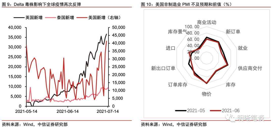 第三階段是6月21日前後到6月CPI公佈之前,該階段美債收益率下行主要由於實際利率快速下行。6月21日前後開始,美債收益率下行的邏輯轉向實際利率進一步走低,這主要反映了在Delta變異毒株快速擴散下美國疫情有所反复衝擊需求端,讓市場對美國經濟復甦的進程有所擔憂。美國疾控中心數據顯示,當前Delta毒株感染病例在美國新冠感染病例中的比重已經超過50%。在G20央行行長和財長會議上,美國財長耶倫表示對於Delta變異毒株威脅經濟復甦“非常擔心”。此外,7月6日,美國公佈非製造業PMI不及預期也助推美債利率快速下行。不僅是在美國,Delta毒株的快速傳播為全球經濟復甦都蒙上了陰影,歐洲和亞洲近期疫情同樣迅速反彈,避險情緒升溫。對經濟復甦前景的擔憂和避險情緒推動實際利率快速下行,帶動美債收益率下行。