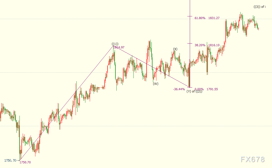 小時圖上看,金價自1792美元開啟上行((3))浪走勢,此前已升破61.8%目標位1831美元,後市或進一步上看76.4%目標位1841美元和85.4%目標位1846美元。((3))浪是自1751美元開啟的上行i浪的子浪。